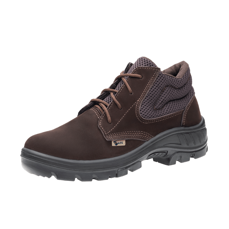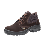 Botina ocupacional com biqueira de plástico, colarinho acolchoado, confeccionada em couro, fechamento em cadarço, forração interna e solado bidensidade. Construção do Calçados: 1. Solado: Constituído de duas camadas de poliuretano (PU), com parte de aparas reintegradas ao processo (economia circular), injetado diretamente no cabedal, sendo a 1ª camada (entressola) mais macia eleve, com densidade de 0,4g/cm³ proporcionando maior conforto; e 2ª camada (sola) mais compacta com densidade de 1,0 g/cm³, resistente à abrasão com sistema antiderrapante constituído de ranhuras especiais de 3mm de altura e 6mm de largura e resistência ao escorregamento em piso cerâmico e piso de aço (Nível SRC); 2. Cabedal: Couro tipo nubuck com espessura de 18 a 20 linhas; 3. Contraforte: Ecológicos, com fibras recicladas. 4. Forração: Em não tecido para Gáspea e Suador oriunda de fibras de garrafa PET. 5. Manta dos forros: PET. 6. Etiquetas: Em plastsol reciclado. 7. Cor: Café; 8. Numeração: PU Bidensidade 33 à 47; 9. Biqueira: Plástico injetado em polipropileno, espessura de 1,5mm. Obs: este tipo de biqueira não tem as mesmas características de segurança do que a biqueira de aço; 10. Palmilha de Montagem: Costurada ao cabedal pelo sistema strobel em poliéster agulhado e resinado com espessura de 2.0 mm; 11. Palmilha Higiênica: Anatômica conformada em EVA antifugo / antibactéria, composta de micropontos que proporcionam absorção e dessorção do suor. 12: Calculadora Ecológica: A cada par de calçado 01 garrafa PET de 01 litro é retirada do meio ambiente.