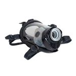 Peça facial panorâmica modelo 2020, em silicone com superfície de selagem larga, lente fixada a uma moldura resistente, touca em Kevlar de 5 pontos para fixação de rápido ajuste por meio de fivelas em material metálico, o bocal aloja uma mascarilha nasal removível, diafragma de conversão e válvula de exalação, acoplamento do regulador de segundo estágio do tipo ENGATE RÁPIDO.